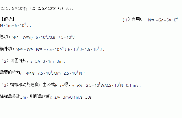 右图是用滑轮组提起重物的装置示意图,物体重G=6×104N,滑轮组的机械效率为80%,拉力F的功率为2.5 kW,要把重物匀速提升1 m,求:
