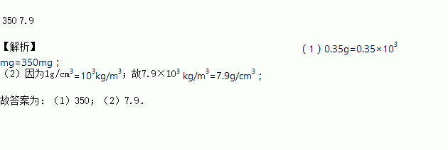 世界上最小的鸟是蜂鸟,它所生的蛋只有0.35g,合____mg;铁的密度是7.9×103kg/m3,合____g/cm3.