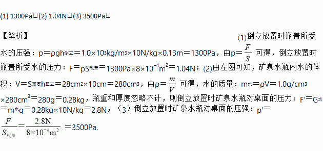 (1) 1300Pa;(2) 1.04N;(3) 3500Pa。 【解析】 (1)倒立放置时瓶盖所受水的压强:p=ρgh倒立=1.0×103kg/m3×10N/kg×0.13m=1300Pa,由p=可得,倒立放置时瓶盖所受水的压力:F=pS瓶盖=1300Pa×8×10?4m2=1.04N;(2)由左图可知,矿泉水瓶内水的体积:V=S瓶底h正立=28cm2×10cm=280cm3,由ρ=可得,...