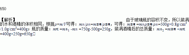 一个能装500g水的玻璃瓶,装满水后的总质量是750g,用该瓶装密度是0.8g/cm3的酒精,则装满酒精后的总质量为___________g。