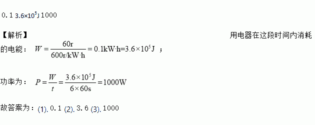 0.1 3.6×105J 1000 【解析】用电器在这段时间内消耗的电能: ; 功率为: 故答案为:(1). 0.1 (2). 3.6 (3). 1000