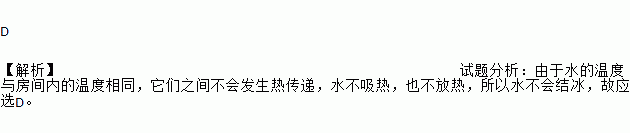 D 【解析】试题分析:由于水的温度与房间内的温度相同,它们之间不会发生热传递,水不吸热,也不放热,所以水不会结冰,故应选D。