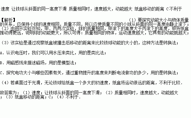 在探究“物体动能的大小与哪些因素有关”的实验中,小明同学设计了如图所示甲、乙、丙三次实验。让铁球从同一斜面上某处由静止开始向下运动,然后与放在水平桌面上的纸盒相碰,铁球与纸盒在水平面上共同移动一段距离后静止。
