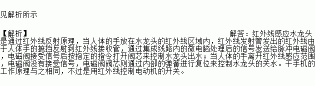见解析所示 【解析】解答:红外线感应水龙头是通过红外线反射原理,当人体的手放在水龙头的红外线区域内,红外线发射管发出的红外线由于人体手的摭挡反射到红外线接收管,通过集成线路内的微电脑处理后的信号发送给脉冲电磁阀,电磁阀接受信号后按指定的指令打开阀芯来控制水龙头出水;当人体的手离开红外线感应范围,电磁阀没有接受信号,电磁阀阀芯则通过内部的弹簧进行复位来控制水龙头的关水。干手机的工作原理与之相同...
