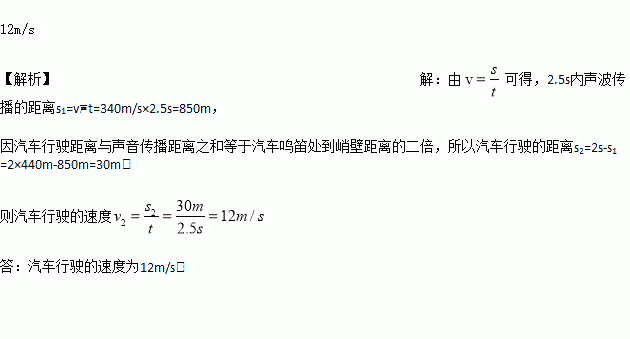 一辆做匀速直线运动的汽车,在距离正前方峭壁440 m处鸣笛后继续前进,经过2. 5 s后听到了从峭壁反射回来的鸣笛声,求汽车行驶的速度。