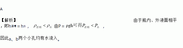 A 【解析】由于瓶内、外液面相平,即h酒精=h水, 由P=, 因此a、b两个小孔均有水流入。