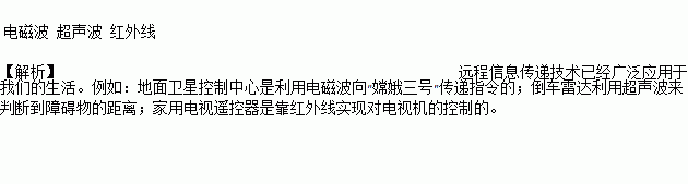 远程信息传递技术已经广泛应用于我们的生活。例如:地面卫星控制中心是利用_____向“嫦娥三号”传递指令的;倒车雷达利用_____来判断到障碍物的距离;家用电视遥控器是靠_____实现对电视机的控制的。(选填“电磁波”、“超声波”、“紫外线”、“红外线”、“可见光”)
