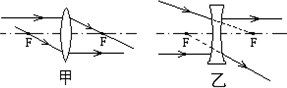 (2)乙图中,延长线过另一侧焦点的光线经凹透镜折射后将平行于主光轴,平行于主光轴的光线经凹透镜折射后,其折射光线的反向延长线过焦点,如下图所示: