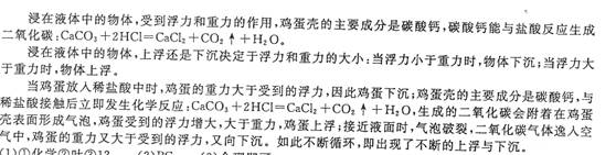 科学课上,老师将一只鸡蛋放入盛有稀盐酸的烧杯中,鸡蛋壳表面很快产生气泡,不一会儿,还出现了非常有趣的一幕,原来沉在烧杯底部的鸡蛋慢慢浮了上来,接近液面后又慢慢往下沉,如此,鸡蛋不断地在液体中上浮、下沉,请你用所学的科学知识对上述有趣的一幕作出合理的解析。