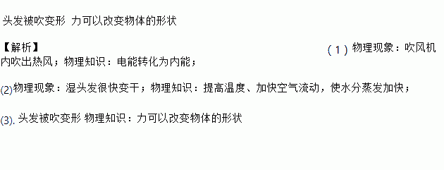 头发被吹变形 力可以改变物体的形状 【解析】(1)物理现象:吹风机内吹出热风;物理知识:电能转化为内能; (2)物理现象:湿头发很快变干;物理知识:提高温度、加快空气流动,使水分蒸发加快; (3). 头发被吹变形 物理知识:力可以改变物体的形状
