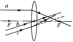 试题分析:凸透镜对光起会聚作用,平行于凸透镜主光轴的光经凸透镜折射后会聚于凸透镜的焦点;过凸透镜主光轴光心的光方向不变。平行于b的c光经凸透镜折射后向靠近主光轴的方向偏折。