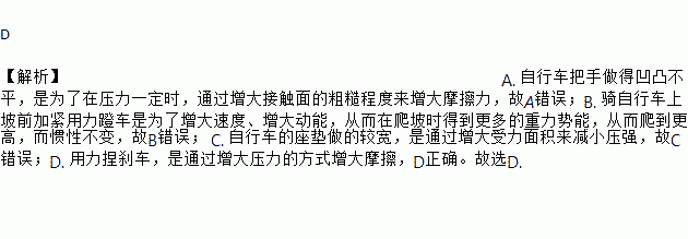 D 【解析】A. 自行车把手做得凹凸不平,是为了在压力一定时,通过增大接触面的粗糙程度来增大摩擦力,故A错误;B. 骑自行车上坡前加紧用力蹬车是为了增大速度、增大动能,从而在爬坡时得到更多的重力势能,从而爬到更高,而惯性不变,故B错误; C. 自行车的座垫做的较宽,是通过增大受力面积来减小压强,故C错误;D. 用力捏刹车,是通过增大压力的方式增大摩擦,D正确。故选D.
