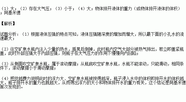 (1)在空矿泉水瓶侧壁不同高度的地方扎出上、中、下二个小孔,往里面倒满水,可以观察到水从三个小孔流了出来,其中最下面的小孔水的流速最 ,可以验证液体压强与深度的关系;