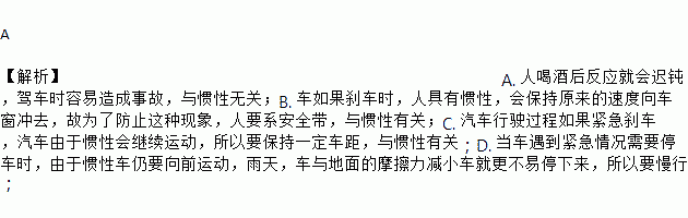 A ¡¾½âÎö¡¿A. È˺Ⱦƺó·´Ó¦¾Í»á³Ù¶Û£¬¼Ý³µÊ±ÈÝÒ×Ôì³Éʹʣ¬Óë¹ßÐÔÎ޹أ»B. ³µÈç¹ûɲ³µÊ±£¬È˾ßÓйßÐÔ£¬»á±£³ÖÔÀ´µÄËÙ¶ÈÏò³µ´°³åÈ¥£¬¹ÊΪÁË·ÀÖ¹ÕâÖÖÏÖÏó£¬ÈËҪϵ°²È«´ø£¬Óë¹ßÐÔÓйأ»C. Æû³µÐÐÊ»¹ý³ÌÈç¹û½ô¼±É²³µ£¬Æû³µÓÉÓÚ¹ßÐÔ»á¼ÌÐøÔ˶¯£¬ËùÒÔÒª±£³ÖÒ»¶¨³µ¾à£¬Óë¹ßÐÔÓйأ»D. µ±³µÓöµ½½ô¼±Çé¿öÐèҪͣ³µÊ±£¬ÓÉÓÚ¹ßÐÔ³µÈÔÒªÏòǰÔ˶¯£¬ÓêÌ죬³µÓëµØÃæµÄĦ²ÁÁ¦¼õС³µ¾Í¸ü²»Ò×Í£ÏÂÀ´£¬ËùÒÔÒªÂýÐУ»