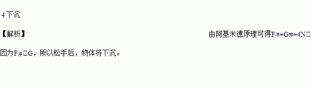 小明用细线系住重为5 N的物体,使其完全浸没在盛满水的溢水杯中,物体排开的水重为4 N,此时物体所受的浮力为_____N,松手后,物体将______(填“上浮”“悬浮”或“下沉”)。(ρ水=1.0×103 kg/m3)