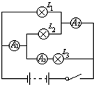 三盏灯的连接方式为并联,电流表A1测的是L2与L3的电流之和,电流表A2测的是L1与L2的电流之和,A2测L3的电流,