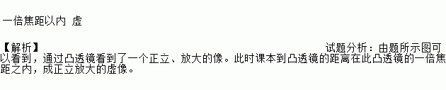 小聪用凸透镜观察到如图所示的现象,此时课本到凸透镜的距离在此凸透镜的__________,成的是正立、放大的____像.