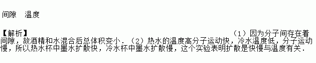 间隙 温度 【解析】(1)因为分子间存在着间隙,故酒精和水混合后总体积变小.(2)热水的温度高分子运动快,冷水温度低,分子运动慢,所以热水杯中墨水扩散快,冷水杯中墨水扩散慢,这个实验表明扩散是快慢与温度有关.