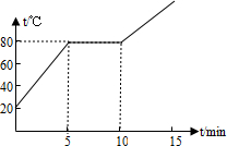 因从第5min开始熔化,且熔点为80℃,则到第5min时,对应的纵轴的温度是80℃,然后是晶体的熔化状态,此过程中温度不变,故线段是水平的,到第10min后,全部熔化完毕,此物质处于液态,然后温度不断升高,如下图所示: