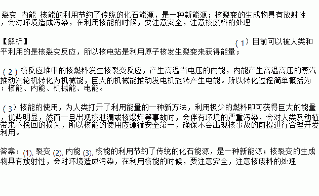 Áѱä ÄÚÄÜ ºËÄܵÄÀûÓýÚÔ¼ÁË´«Í³µÄ»¯Ê¯ÄÜÔ´£¬ÊÇÒ»ÖÖÐÂÄÜÔ´£»ºËÁѱäµÄÉú³ÉÎï¾ßÓзÅÉäÐÔ£¬»á¶Ô»·¾³Ôì³ÉÎÛȾ£¬ÔÚÀûÓúËÄܵÄʱºò£¬Òª×¢Òⰲȫ£¬×¢ÒâºË·ÏÁϵĴ¦Àí ¡¾½âÎö¡¿£¨1£©Ä¿Ç°¿ÉÒÔ±»ÈËÀàºÍƽÀûÓõÄÊǺËÁѱ䷴Ӧ£¬ËùÒԺ˵çÕ¾ÊÇÀûÓÃÔ×Ӻ˷¢ÉúÁѱäÀ´»ñµÃÄÜÁ¿£» £¨2£©ºË·´Ó¦¶ÑÖеĺËȼÁÏ·¢ÉúºËÁѱ䷴Ӧ£¬²úÉú¸ßε±µçѹµÄÄÚÄÜ£¬ÄÚÄܲúÉú¸ßθßѹµÄÕôÆûÍÆ¶¯ÆûÂÖ»úת»¯Îª»úеÄÜ£¬¾Þ´óµÄ»úеÄÜÍÆ¶¯·¢µç»úÐýת²úÉúµçÄÜ...