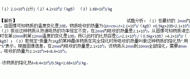 实验测得0.5kg某物质温度随时间变化的图象如图示,已知物质在固态下的比热容为c1=2.1×103J/(kg•℃).假设这种物质从热源吸热的功率恒定不变,根据图象解析下列问题: