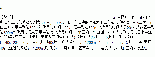 C ¡¾½âÎö¡¿A. ÓÉͼ֪£¬Ç°10sÄڼ׳µºÍÒÒ³µÔ˶¯µÄ·³Ì·Ö±ðΪ300m¡¢200m£¬Ôò¼×³µÔ˶¯µÄ·³Ì´óÓÚÒÒ³µÔ˶¯µÄ·³Ì£¬¹ÊAÕýÈ·£»B. ÓÉͼ֪£¬¼×³µµ½´ï600m´¦ËùÓõÄʱ¼äΪ20s£¬ÒÒ³µµ½´ï600m´¦ËùÓõÄʱ¼ä´óÓÚ20s£¬ËùÒÔÒÒ³µµ½´ï600m´¦ËùÓÃʱ¼ä´óÓڼ׳µ´ï´Ë´¦ËùÓÃʱ¼ä£¬¹ÊBÕýÈ·£»C. ÓÉͼ֪£¬ÔÚÏàͬµÄʱ¼äÄÚÒÒС³µÍ¨¹ýµÄ·³ÌÔÚ±ä´ó£¬ËµÃ÷С³µÔÚ×ö±äËÙÔ˶¯£»¹ÊC´íÎó£»´Ó20sʱµ½40sËùÓõÄʱ...