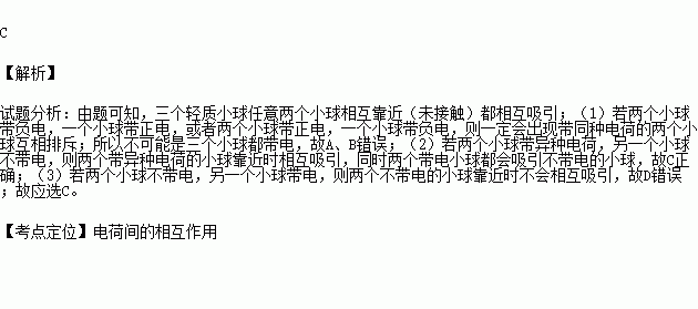 现有三个轻质小球,实验发现其中任意两个小球相互靠近(未接触)都相互吸引.由此可判断( )