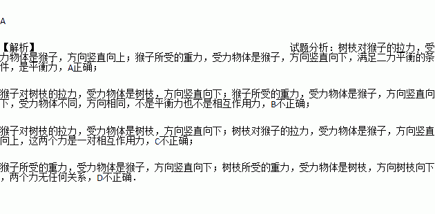 当猴子倒挂树枝上静止时,下列说法正确的是( )
