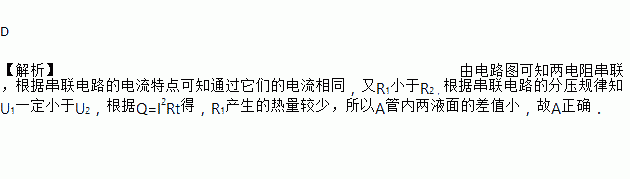 D ¡¾½âÎö¡¿Óɵç·ͼ¿ÉÖªÁ½µç×è´®Áª£¬¸ù¾Ý´®Áªµç·µÄµçÁ÷ÌØµã¿É֪ͨ¹ýËüÃǵĵçÁ÷Ïàͬ£¬ÓÖR1СÓÚR2£¬¸ù¾Ý´®Áªµç·µÄ·Öѹ¹æÂÉÖªU1Ò»¶¨Ð¡ÓÚU2£¬¸ù¾ÝQ=I2RtµÃ£¬R1²úÉúµÄÈÈÁ¿½ÏÉÙ£¬ËùÒÔA¹ÜÄÚÁ½ÒºÃæµÄ²îֵС£¬¹ÊAÕýÈ·£®