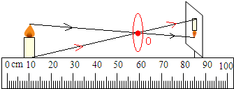 解答:解:连接烛焰的顶端的烛焰像的对应点,连接蜡烛底部和蜡烛底部的对应点,两条直线相交于O,O是凸透镜的光心,由光心的位置确定凸透镜的位置,即在60cm处画出凸透镜.如图.