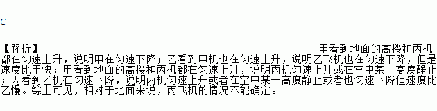 C 【解析】甲看到地面的高楼和丙机都在匀速上升,说明甲在匀速下降;乙看到甲机也在匀速上升,说明乙飞机也在匀速下降,但是速度比甲快;甲看到地面的高楼和丙机都在匀速上升,说明丙机匀速上升或在空中某一高度静止;丙看到乙机在匀速下降,说明丙机匀速上升或者在空中某一高度静止或者也匀速下降但速度比乙慢。综上可见,相对于地面来说,丙飞机的情况不能确定。
