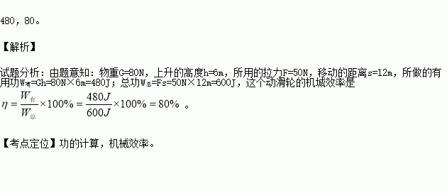 用一个动滑轮把80N的沙袋从地面提到6m高的脚手架上,所用的力是50 N,这一过程所做的有用功是 J,这个动滑轮的机城效率是 。