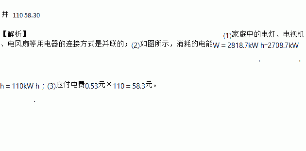 家庭中的电灯、电视机、电风扇等用电器都是________联在电路中的。小林家4月底电能表读数为2708.7 kW·h,5月底电能表读数如图所示,那么5月份他家消耗了________ kW·h的电能。若电价为0.53元/kW·h,则需电费_________元。