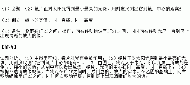 £¨1£©»á¾Û £¨2£©¾µÆ¬Õý¶ÔÌ«Ñô¹âµÃµ½×îС×îÁÁµÄ¹â°ß£¬Óÿ̶ȳ߲â³öËüµ½¾µÆ¬ÖÐÐĵľàÀëf £¨3£©µ¹Á¢¡¢ËõСµÄʵÏñ£¬Í¬Ò»Ö±Ïß¡¢Í¬Ò»¸ß¶È £¨4£©Ìõ¼þ£ºÎï¾àÔÚf~2fÖ®¼ä¡£²Ù×÷£ºÏòÓÒÒÆ¶¯À¯ÖòÖÁf~2fÖ®¼ä£¬Í¬Ê±ÏòÓÒÒÆ¶¯¹âÆÁ£¬Ö±µ½ÆÁÉϳöÏÖÇåÎúµÄ·Å´óµÄÏñ¡£ ¡¾½âÎö¡¿ ÊÔÌâ·ÖÎö£º£¨1£©ÓÉͼ¼×¿ÉÖª£¬¾µÆ¬¶Ô¹âÓлá¾Û×÷Óᣣ¨2£©¾µÆ¬Õý¶ÔÌ«Ñô¹âµÃµ½×îС×îÁÁµÄ¹â°ß£¬Óÿ̶ȳ߲â³öËüµ½¾µÆ¬ÖÐÐĵľàÀëf ...