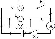解答:解:从正极开始,电流经过S1和电流表A后进行分支,一支经电键S2、灯泡L1;另一支经灯泡L2;然后两路汇合共同经过开关后回到电源负极;电压表并联在L1两端;并表出电流的方向.如图所示: