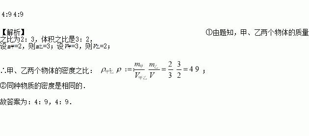 甲、乙两物体的质量之比为2:3,体积之比为3:2,则甲、乙两物体的密度之比为___________;若把甲物体截去一半,则甲、乙两物体的密度之比为_________。