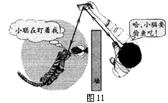 如图11所示是关于小猫和小聪的一幅漫画,图中两条光线的夹角是60°,则小聪观察小猫光路的入射角是 度,此现象说明在反射时,光路是 。