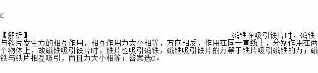 C ¡¾½âÎö¡¿´ÅÌúÔÚÎüÒýÌúƬʱ£¬´ÅÌúÓëÌúƬ·¢ÉúÁ¦µÄÏ໥×÷Óã¬Ï໥×÷ÓÃÁ¦´óСÏàµÈ£¬·½ÏòÏà·´£¬×÷ÓÃÔÚͬһֱÏßÉÏ£¬·Ö±ð×÷ÓÃÔÚÁ½¸öÎïÌåÉÏ£¬¹Ê´ÅÌúÎüÒýÌúƬʱ£¬ÌúƬҲÎüÒý´ÅÌú£¬´ÅÌúÎüÒýÌúƬµÄÁ¦µÈÓÚÌúƬÎüÒý´ÅÌúµÄÁ¦£»´ÅÌúÓëÌúƬÏ໥ÎüÒý£¬¶øÇÒÁ¦´óСÏàµÈ£»´ð°¸Ñ¡C¡£
