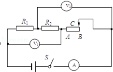 如图所示电路中,电源电压一定.闭合开关,当滑动变阻器的滑片P在中点C时,电压表V1的示数为9V,电压表V2的示数为U2,变阻器消耗的功率为9W;当滑动变阻器的滑片P滑到B端时,电压表V2的示数为U'2,变阻器消耗的功率为8W;若U2:U'2=5:6.求: