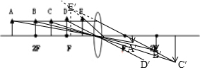 A点的像是倒立缩小的实像,为A′;B点的像是倒立等大实像,为B′;C点的像是倒立放大的实像,为C′;