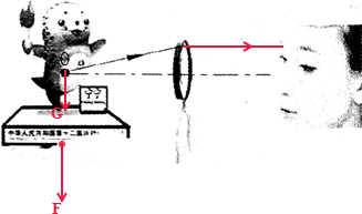 2012年6月2日,第十二届全国运动会吉祥物--“宁宁”的创意灵感来源于具有“渤海明珠”美誉的斑海豹.如图所示,手托一个“宁宁”的摆件静止,试着画出摆件所受到的重力G和对手的压力F(摆件的重心O已标出).若此时O点恰好在放大镜的左侧焦点处,试画出由O点发出的光线经过放大镜折射后的大致光路.(提示:该折射光线不会射到人眼,且透镜的主光轴已经用点划线标出)