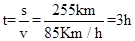 解析试题分析:一般交通运输工具的速度的单位是Km/h,一辆小轿车在高速公路上行驶时的速度为85Km/h。按照这个速度走完255km的路程需要的时间为