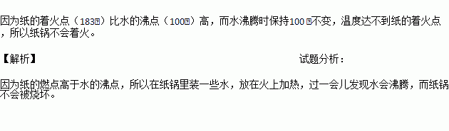 用纸做的锅里装些水,放到火上加热,过一会儿水就沸腾了,而纸锅却不会着火,为什么?