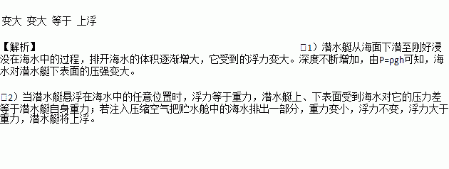 DZˮͧ´Óº£ÃæÏÂDZÖÁ¸ÕºÃ½þûÔÚº£Ë®ÖеĹý³Ì£¬ËüÊܵ½µÄ¸¡Á¦_____£¬º£Ë®¶ÔDZˮͧϱíÃæµÄѹǿ_____£¨Á½¿Õ¾ùÑ¡Ì¡°±ä´ó¡±¡¢¡°²»±ä¡±»ò¡°±äС¡±£©¡£µ±Ç±Ë®Í§Ðü¸¡ÔÚº£Ë®ÖеÄÈÎÒâλÖÃʱ£¬Ç±Ë®Í§ÉÏ¡¢Ï±íÃæÊܵ½º£Ë®¶ÔËüµÄѹÁ¦²î_____£¨Ñ¡Ì¡°´óÓÚ¡±¡¢¡°Ð¡ÓÚ¡±»ò¡°µÈÓÚ¡±£©Ç±Ë®Í§×ÔÉíÖØÁ¦£»´Ëʱ£¬Èô×¢ÈëѹËõ¿ÕÆø°ÑÖüË®²ÕÖеĺ£Ë®ÅųöÒ»²¿·Ö£¬Ç±Ë®Í§½«_____£¨Ñ¡Ì¡°Éϸ¡¡±¡¢¡°Ðü¸¡¡±»ò¡°Ï³Á¡±) £®
