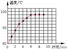 为了研究水的沸腾,小丽观察了水在加热过程中温度随加热时间的变化情况,并记录了有关数据如下表:| 时间/min | 1 | 2 | 3 | 4 | 5 | 6 | 7 | 8 | 9 | |
