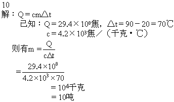 某太阳能浴室,每天可以吸收到太阳的能量是29.4×焦,这些热量可以使_________吨20℃的水温度升高到90℃.