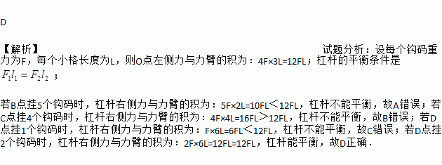 D ¡¾½âÎö¡¿ÊÔÌâ·ÖÎö£ºÉèÿ¸ö¹³ÂëÖØÁ¦ÎªF£¬Ã¿¸öС¸ñ³¤¶ÈΪL£¬ÔòOµã×ó²àÁ¦ÓëÁ¦±ÛµÄ»ýΪ£º4F¡Á3L=12FL£»¸Ü¸ËµÄƽºâÌõ¼þÊÇ£» ÈôBµã¹Ò5¸ö¹³Âëʱ£¬¸Ü¸ËÓÒ²àÁ¦ÓëÁ¦±ÛµÄ»ýΪ£º5F¡Á2L=10FL£¼12FL£¬¸Ü¸Ë²»ÄÜÆ½ºâ£¬¹ÊA´íÎó£»ÈôCµã¹Ò4¸ö¹³Âëʱ£¬¸Ü¸ËÓÒ²àÁ¦ÓëÁ¦±ÛµÄ»ýΪ£º4F¡Á4L=16FL£¾12FL£¬¸Ü¸Ë²»ÄÜÆ½ºâ£¬¹ÊB´íÎó£»ÈôDµã¹Ò1¸ö¹³Âëʱ£¬¸Ü¸ËÓÒ²àÁ¦ÓëÁ¦±ÛµÄ»ýΪ£ºF¡Á6L=6FL...