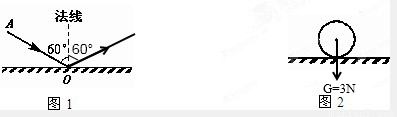(1)在图1中,根据给出的入射光线AO画出反射光线OB,并标出反射角及其度数.(2)重为3N的小球静止在水平面上,用力示意图在图2中画出它所受重力G.