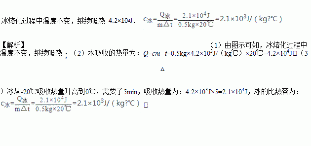 СºìÔÚѧϰÁË¡°±ÈÈÈÈÝ¡±µÄÓйØÖªÊ¶ºó£¬ÖªµÀµ¥Î»ÖÊÁ¿µÄ²»Í¬ÎïÖÊÔÚÉý¸ßÏàͬζÈʱ£¬ËùÎüÊÕµÄÈÈÁ¿²»Í¬£¬ÎªÁËÃèÊöÎïÖʵÄÕâÖÖÐÔÖÊ£¬ÒýÈëÁËÒ»¸öеÄÎïÀíÁ¿¡ª¡ª±ÈÈÈÈÝ£¬ÓÚÊÇËýÓÖÏëµ½¾§ÌåÔÚÈÛ»¯Ê±£¬Î¶ÈËäÈ»±£³Ö²»±ä£¬µ«ÐèÒªÎüÊÕÈÈÁ¿£¬ÄÇôµ¥Î»ÖÊÁ¿µÄ²»Í¬¾§ÌåÈÛ»¯Ê±ËùÎüÊÕµÄÈÈÁ¿ÊÇ·ñÏàÍ¬ÄØ£¿´ø×ÅÕâ¸öÒÉÎÊ£¬Ð¡ºìÔÚʵÑéÊÒÀûÓõçÈÈÆ÷¼ÓÈÈ£¬Íê³ÉÁ˱ùµÄÈÛ»¯ÊµÑ飬²¢Ãè»æ³ö±ùµÄζÈËæ¼ÓÈÈʱ¼ä±ä»¯µÄ¹ØÏµÍ¼ÏßÈçͼËùʾ¡£ÊµÑéʱ£¬±ùµÄÖÊÁ¿Îª0.5kg£¬Ïàͬʱ¼ä±ùºÍË®ÎüÊÕµÄÈÈÁ¿Ïàͬ¡£Ë®µÄ±ÈÈÈÈÝΪ4.2¡Á103J/(kg¡¨¡æ)