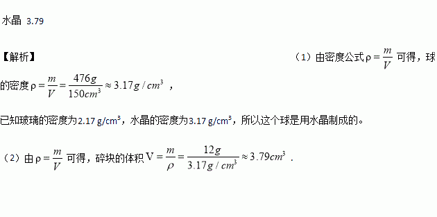 小明有一个猴年吉祥的实心水晶球,由于商家经常把透明的玻璃冒充水晶,于是他想鉴别其材料是玻璃还是水晶的,经查阅资料后知,玻璃的密度为2.17 g/cm3,水晶的密度为3.17 g/cm3;测量得到水晶球的体积为150 cm3,质量为0.476 kg,则这个球是用________制成的,若把球不小心摔碎了,则其中一个质量为12 g的碎块的体积为________cm3。